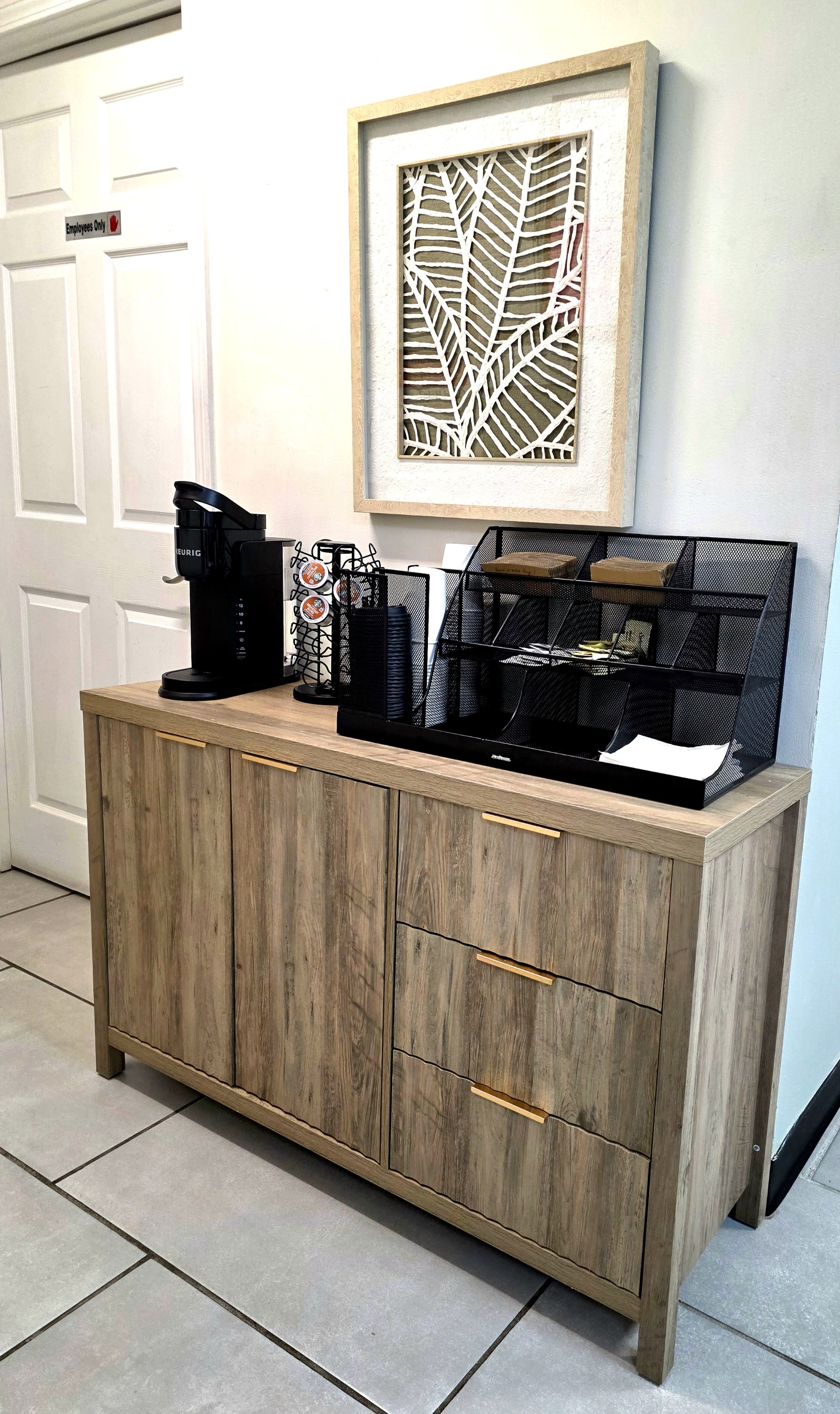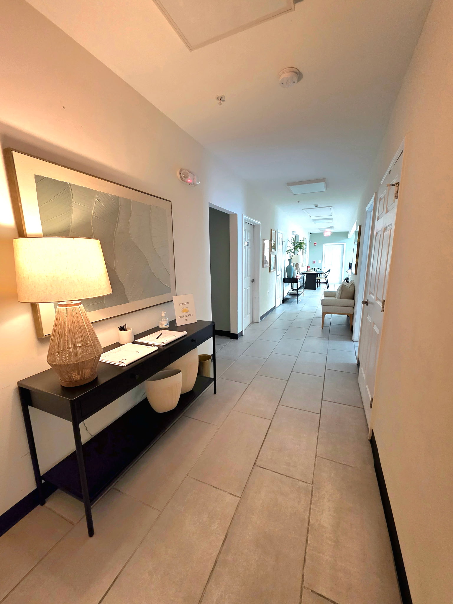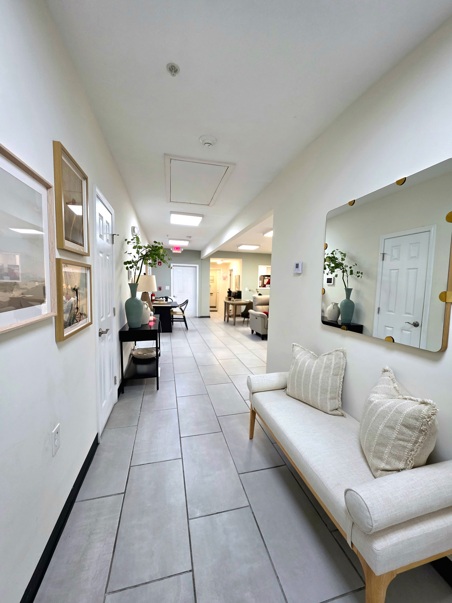 The facility is tastefully furnished, featuring soft colors, natural light, and elegant